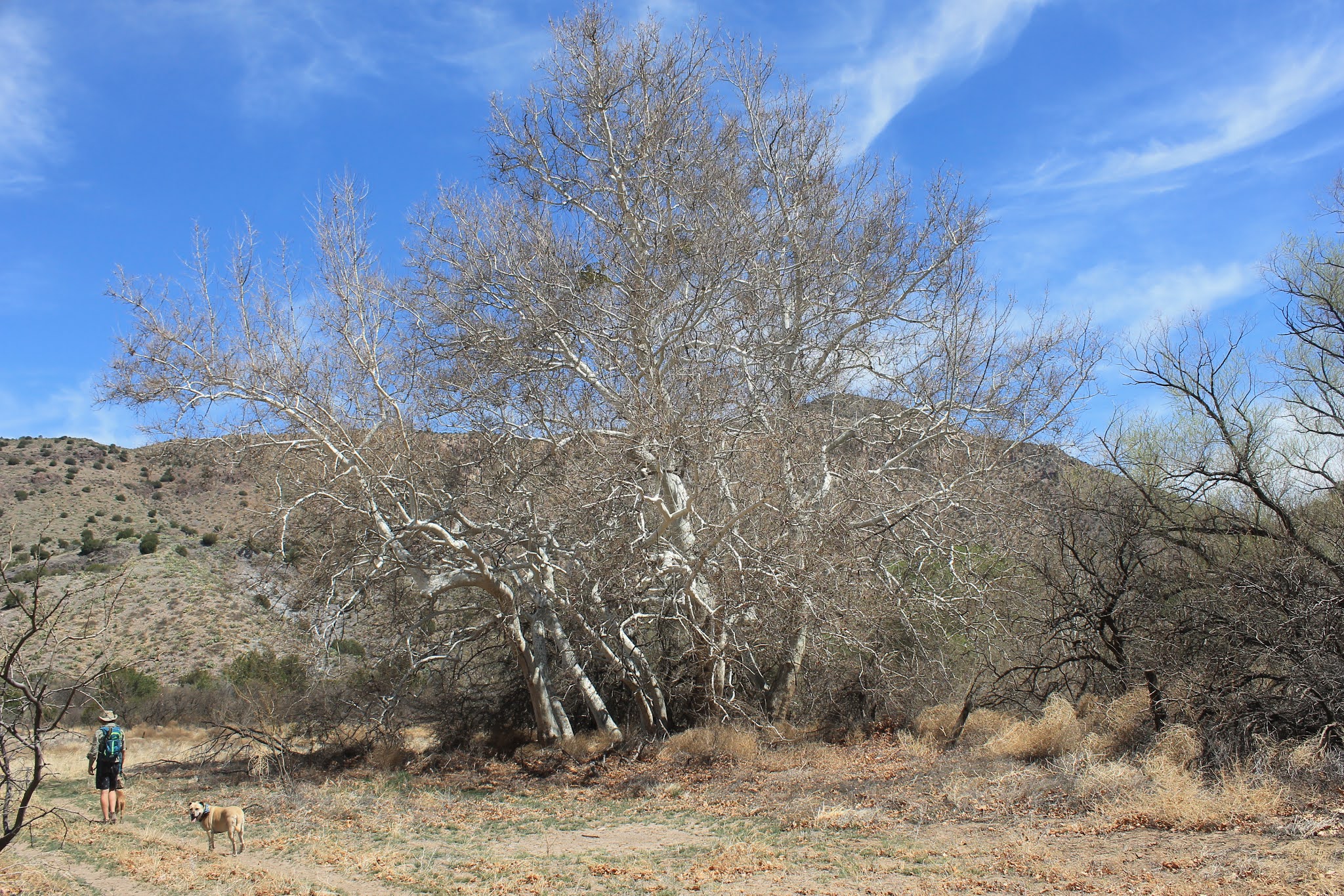 Signal dropped when the paved road turned to gravel, about 2.5 miles (5 minutes) from the actual camping area. The drive in lead through a field of prickly pear cacti and scrubby bushes, as the surrounding mountains loomed over us. From the overlook area up top, we could see most of the campground. Tall trees thick with lime green leaves lined the Gila River below, with a few giant white trees with twisted branches mixed in.
